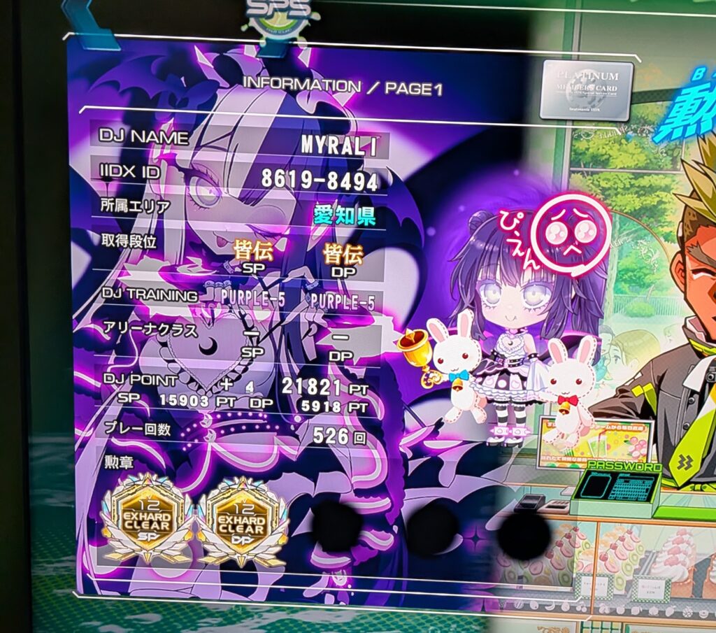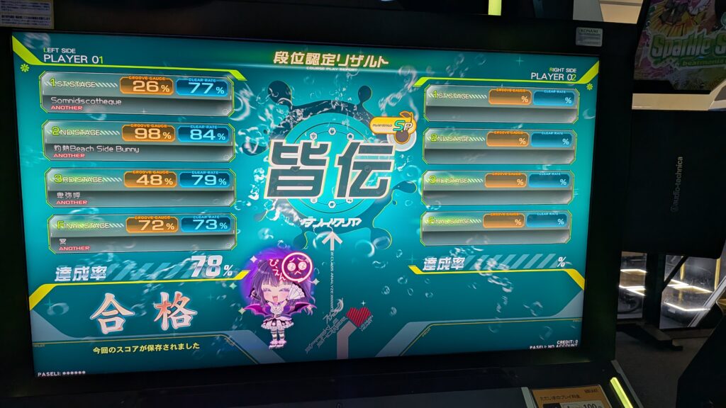何がなんでも取るぞとなった時点では卑弥呼の1軸地帯や二重階段あたりで落ちていました。で13ベチャ運指を取り入れたり色々やる中で灼熱は開幕以外ぜんぶ片手でやればそこそこできるじゃんとなってハードもつき、その結果卑弥呼1軸の100%突入が安定してたまに冥まで行けるようになり、ただ序盤全然回復できず加速地帯BPM140ぐらいで落ち、地力A+ハードが埋まる筋肉をつけたらブインブイン見えるところまで来て、あとは運とか体調とかのガチャを何度か回して晴れて合格となりました。